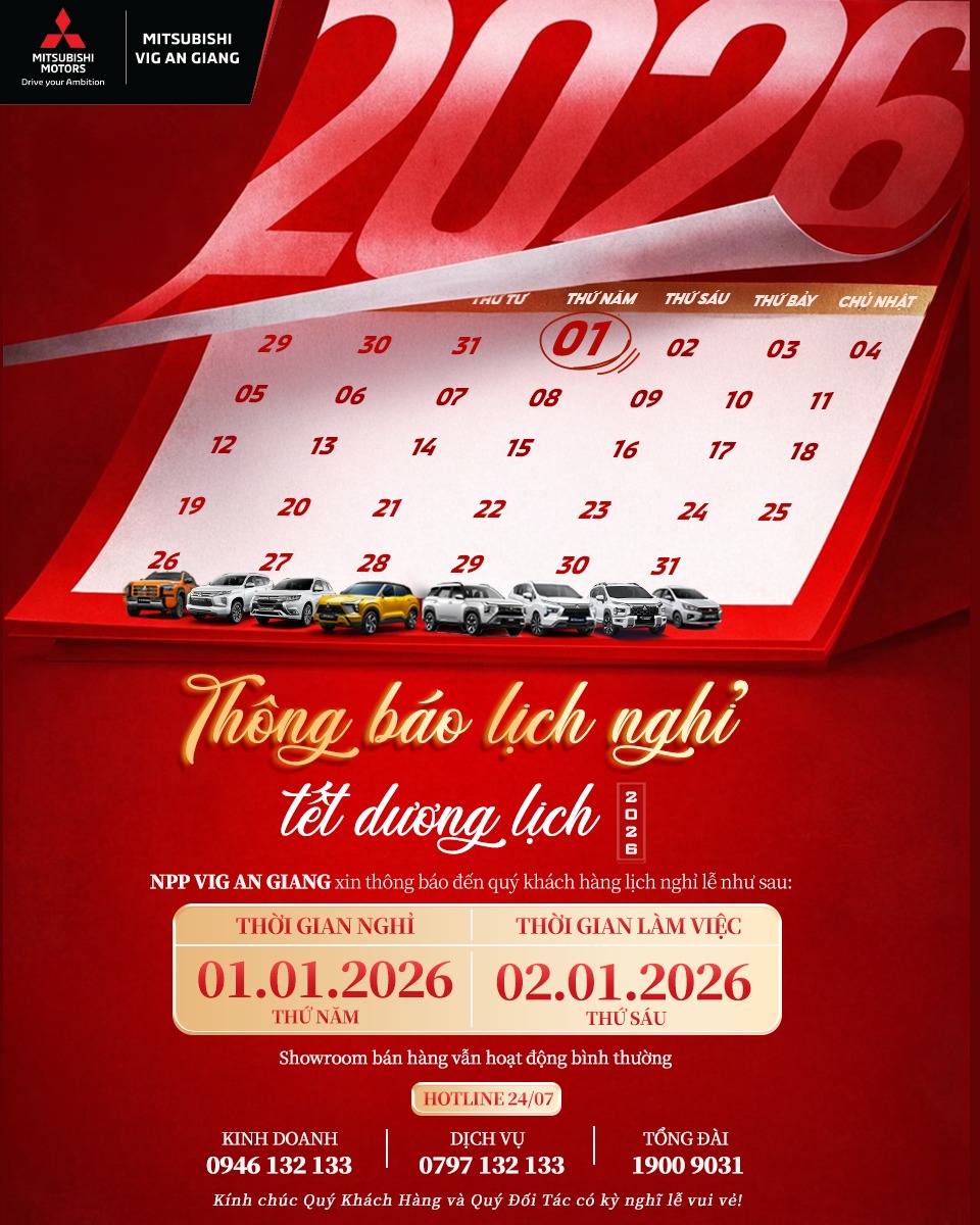Kính gửi: Quý Khách hàng & Quý Đối tác, NPP MITSUBISHI VIG AN GIANG xin trân trọng thông báo lịch nghỉ Tết Dương Lịch như sau: