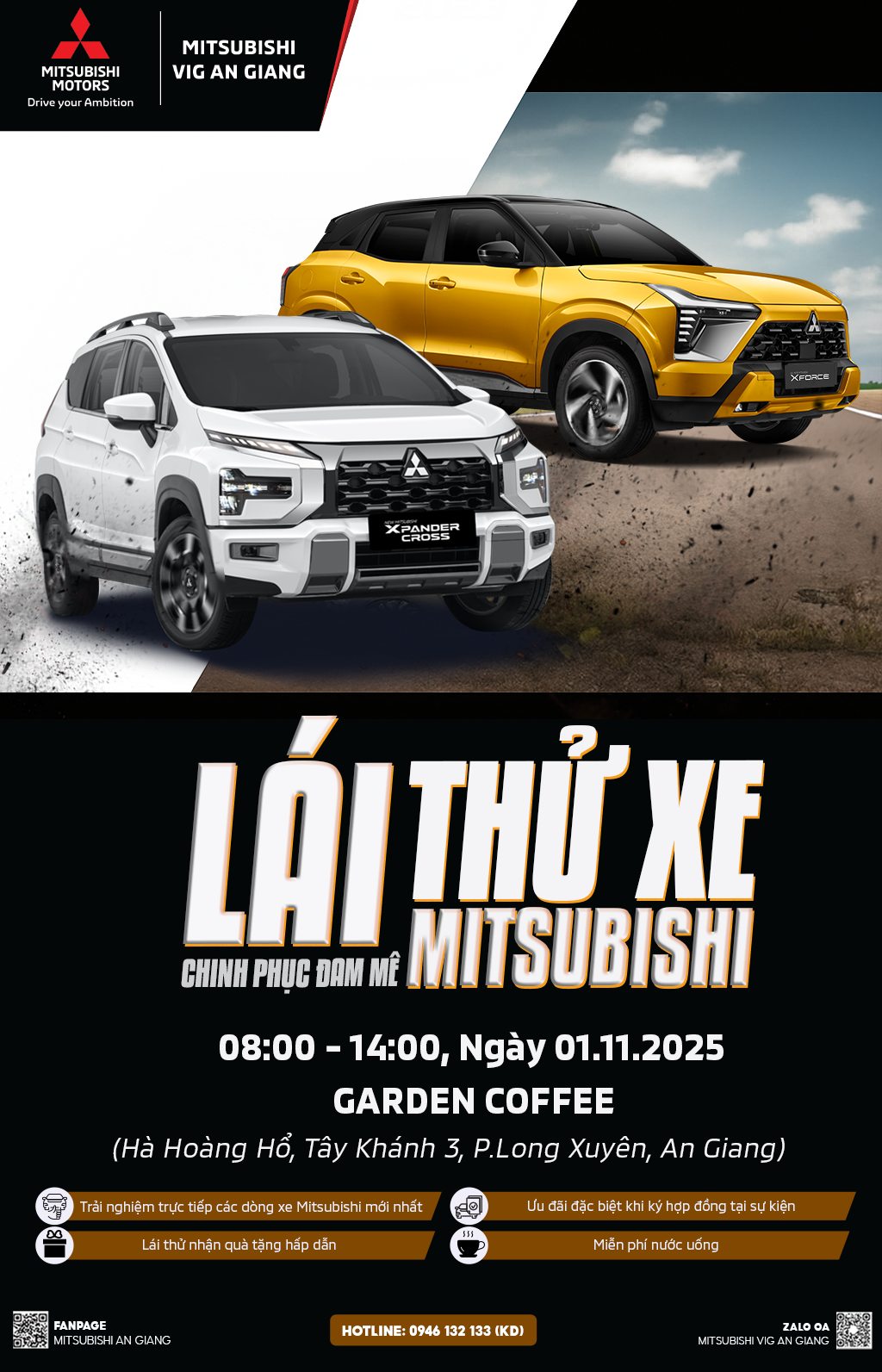 Đăng ký ngay hôm nay qua inbox fanpage hoặc gọi hotline: 0946 132 133 (KD) Hẹn gặp bạn tại GARDEN COFFEE – Cùng nhau khởi động đam mê với Mitsubishi nhé!