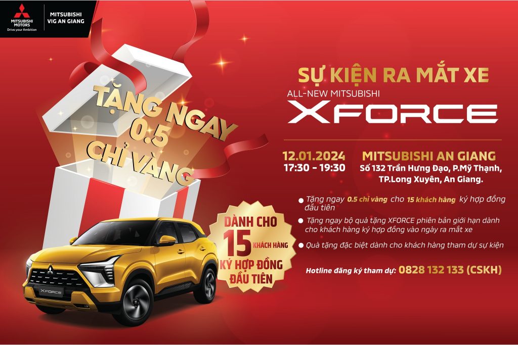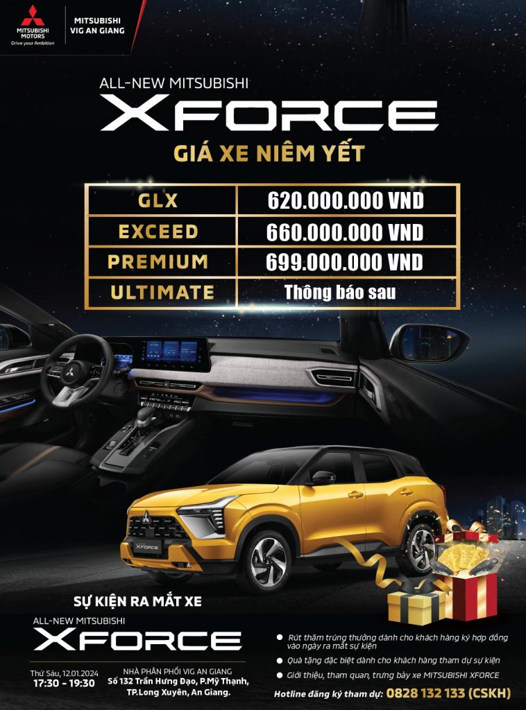 Giá bán 4 phiên bản chính thức: Mitsubishi XFORCE GLX: 620.000.000 VNĐ Mitsubishi XFORCE EXCEED: 660.000.000 VNĐ Mitsubishi XFORCE PREMIUM: 699.000.000 VNĐ Mitsubishi XFORCE ULTIMATE: thông báo sau Đếm ngược 2 ngày nữa để tham dự sự kiện tại NPP VIG AN GIANG nhé! Thời gian: 𝟭𝟳𝗵𝟯𝟬 – 𝘁𝗵𝘂̛́ 𝟲, 𝗻𝗴𝗮̀𝘆 𝟭𝟮/𝟬𝟭/𝟮𝟬𝟮𝟰 Địa Điểm: SHOWROOM […]